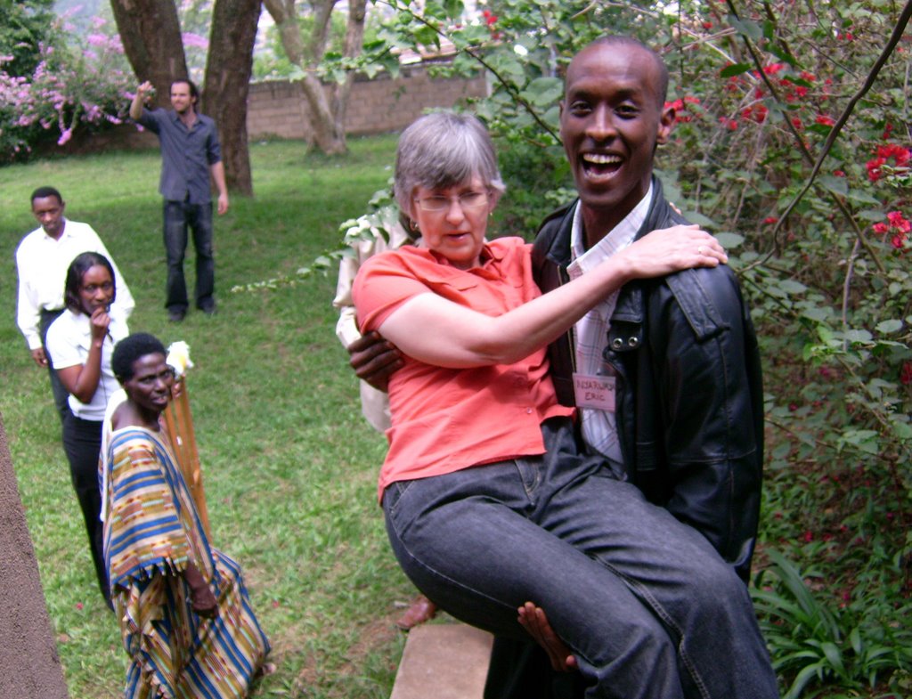 La F.E.P. (Fraternité évangélique des prisons), sous l’habile direction du Révérend John Ngabo et de son comité au Rwanda, Burundi and RDCongo (Kivu) étaient responsables pour l’organisation de nos sessions de formation. Vingt-et-un aumôniers, pasteurs et bénévoles, participèrent à la première pleine semaine au Rwanda à l’introduction à la justice réparatrice (JR). La maison anglicane à Kigali nous accueillit pour ces sessions. Pierre, Philippe et Eileen enseignèrent Valeurs et Principes de la JR, le Mur historique, Modèles d’aumônerie, Justice biblique et justice réparatrice, JR et l’offenseur, JR et la victime, Étapes de guérison, JR et la communauté, Implications avec les femmes, et Mission et Vision. Les participants partagèrent, s’impliquèrent dans des scènes, bâtirent le mur historique, prièrent, réfléchirent, chantèrent et dansèrent. En me servant de matériaux bien concrets, j’ai essayé pour la réflexion et prière matinales de créer quelque chose qui rejoindrait le groupe. C’est ainsi que nous avons bâti une maison en papier multicolore avec des briques rappelant les valeurs et techniques apprises. ( Bien sûr, ces créations pour la prière et réflexion varièrent chaque semaine dépendamment du contexte culturel.) Comme Eileen était tombée dans un fossé et s’était cassée la jambe, elle fut évidemment en retard cette semaine-là! Après une opération et des journées difficiles à l’hôpital, elle fut à même de rejoindre le groupe. Jeff parla d’alpinisme avec tout un assortissement d’équipement à l’appui. Il fallait voir les yeux écarquillés ( mais ils sont ‘fous’ ces canandiens!) alors qu’il s’habillait pour escalader les rochers. Emanuel expliqua certains faits fascinants de la photographie et de son travail/passe-temps en ‘snowboarding’. Chaque nouvel élément d’information servait à illustrer la nécessité de garder nos esprits ouverts, d’être prêts à voir le monde sous un nouvel angle et à tenter de nouvelles façons de réagir à l’injustice et de pratiquer la justice.